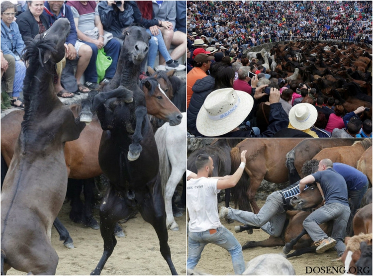 0 В первые выходные июля в Сабуседо, что в 100 километрах к югу от столицы Галисии, города Сантьяго-де-Компостела, стартовал ежегодный фестиваль "Rapa das Bestas". Сотни диких лошадей сгоняют с гор на стадион, где отважные мужчины должны остричь им гривы и хвосты. В течении трех дней 30 укротителей лошадей "Aloitadores" должны голыми руками поймать всех скакунов, остричь и заклеймить молодых жеребцов. Фестиваль проходит уже более 400 лет и привлекает в Испанию тысячи людей.