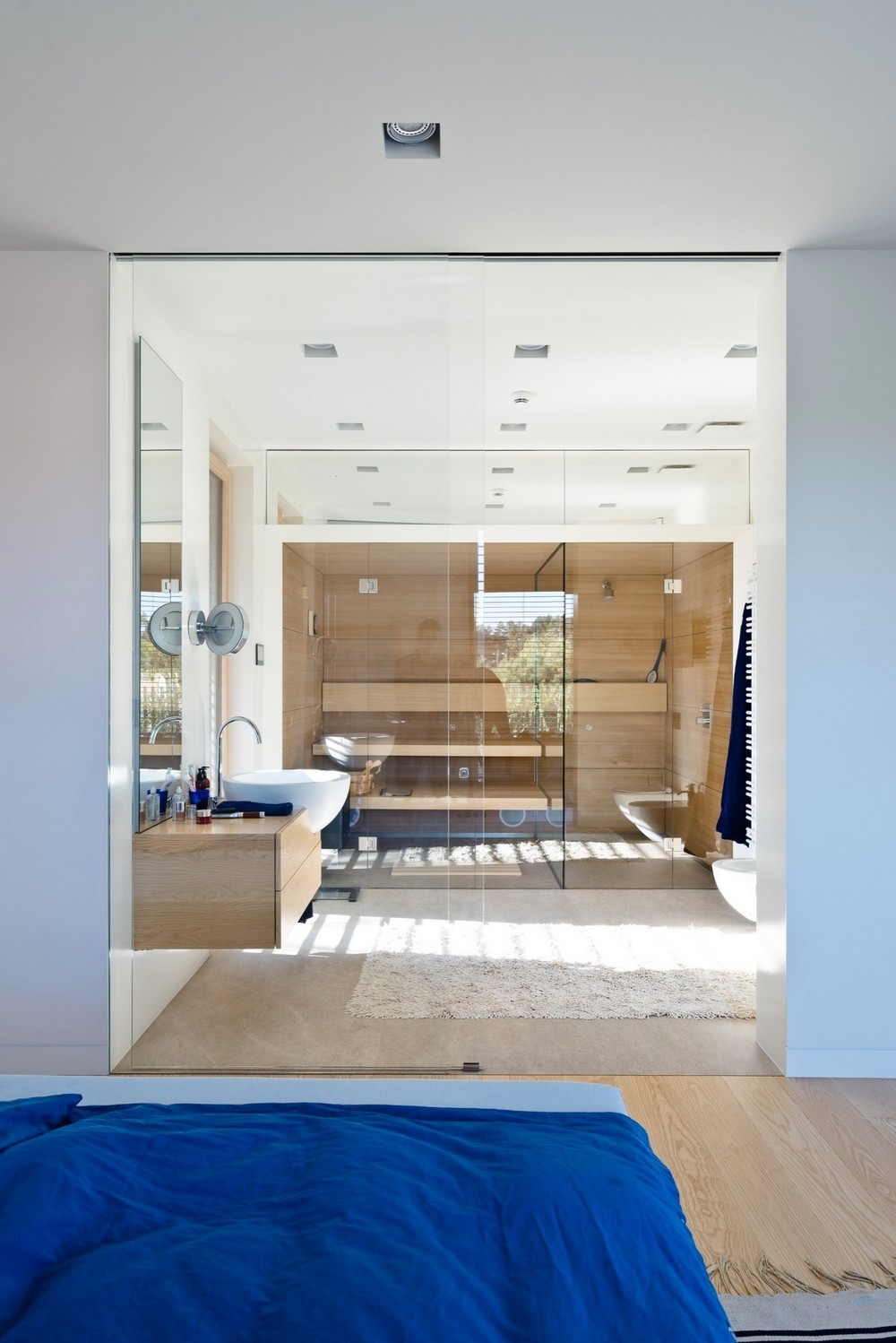 Резиденция выполнена одноэтажной и идеально продумана для жизни одного хозяина. Она тесно связана с садом и террасой для отдыха благодаря панорамному остеклению, обеспечивающему беспрепятственное проникновение внутрь потоков солнечного света. Исключение составляет лишь лицевая сторона здания, имеющая простой, компактный и замкнутый фасад. В интерьере резиденции царит тёплая цветовая гамма, наполняющая пространство спокойствием и внутренним равновесием.