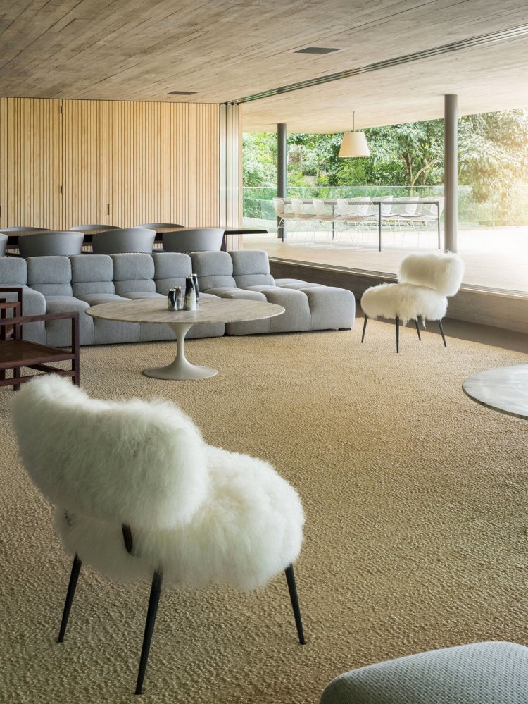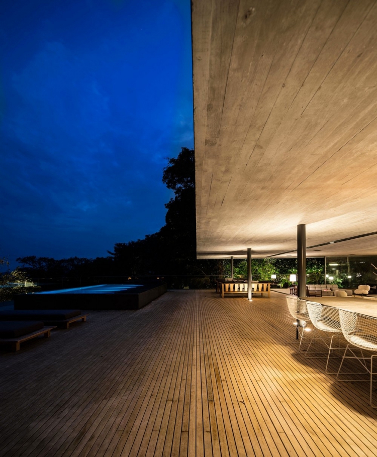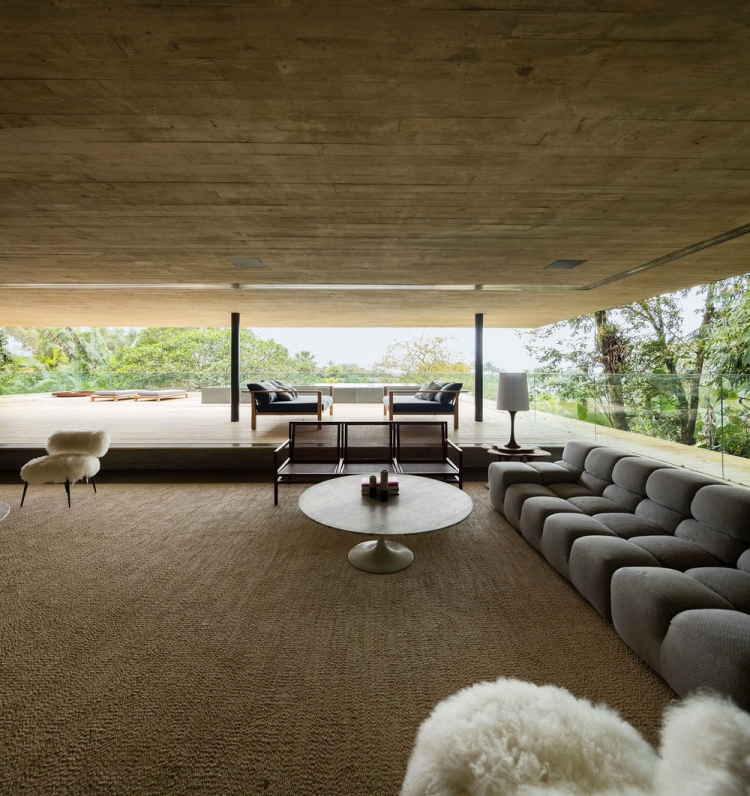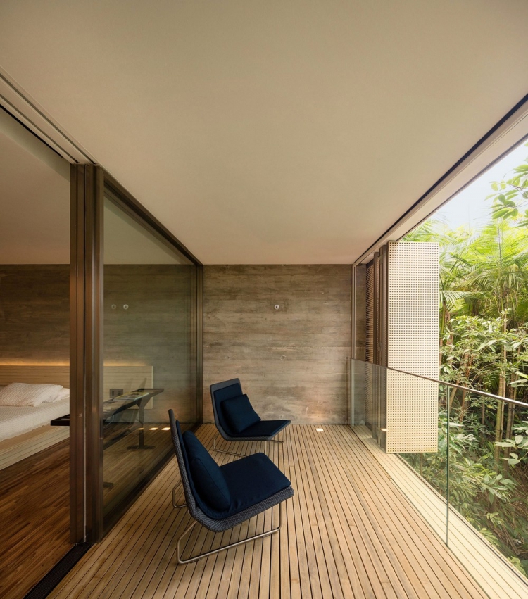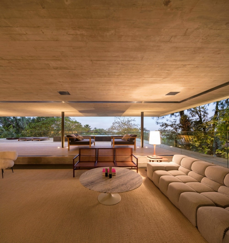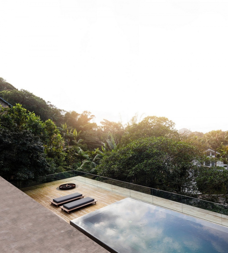 Работая над проектом, очевидно было, что конструкция здания непременно должна была сливаться с окружением, не нанося при этом вреда природе. В интерьере заказчик хотел видеть открытые пространства для обеспечения тесной взаимосвязи между жильцами, а также для простого диалога с окружающими джунглями. Натуральное освещение во всех комнатах дома было необходимо, равно как и панорамные виды. Конструкция базируется на двух опорных колоннах, имеет форму прямоугольника и благодаря отделке из дерева хорошо сливается с деревьями вокруг. Гостей встречает бетонный коридор, украшенный дизайнерским светильником от Olafur Eliasson. На первом этаже дома спроектированы детские спальни и деревянная терраса, пригодная для игр. На втором уровне расположены шесть спален с верандами и гамаками для хозяев и их гостей, а на самом верхнем этаже представлена гостиная зона с комнатой отдыха, кухней столовой, бескрайним бассейном, сауной и застеклённой террасой. В отделке дома доминируют дерево и бетон, которые дополняются присутствием дикой природы вокруг резиденции.