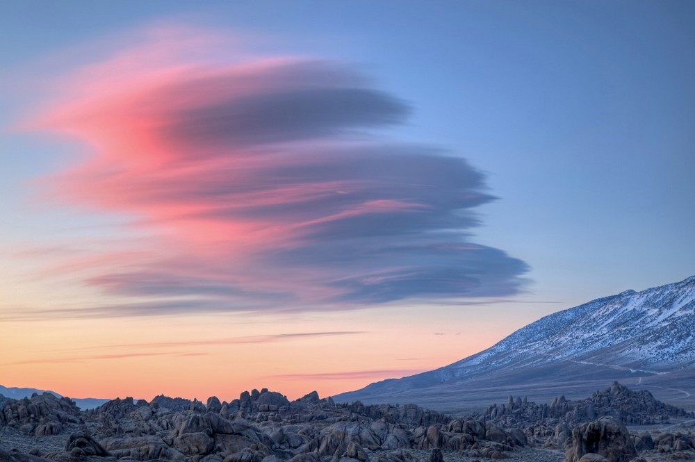Лентикулярные (линзовидные) облака — одно из красивейших и достаточно редких явлений. Главная особенность этих облаков в том, что они остаются недвижимы даже при очень сильном ветре. Как правило, такие облака появляются с подветренной стороны горных хребтов, за хребтами и отдельными вершинами на высоте от 2 до 15 километров.