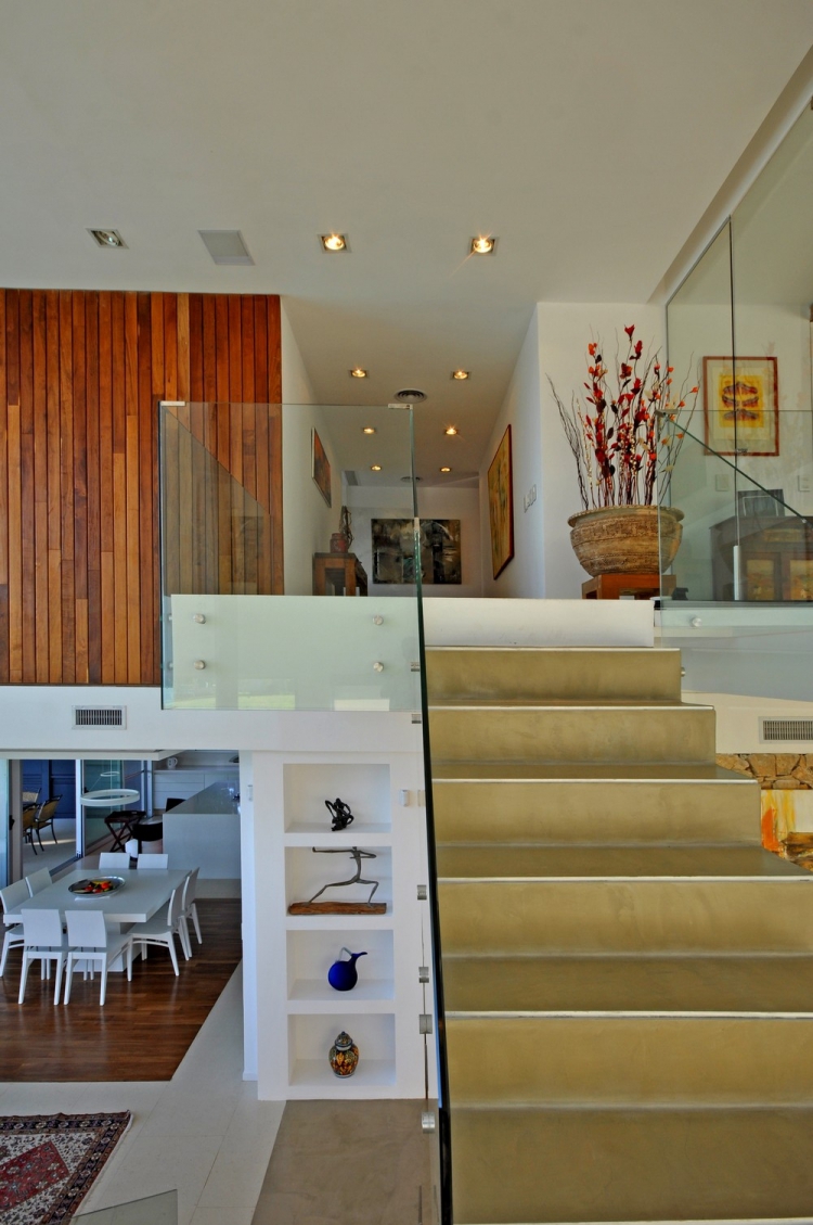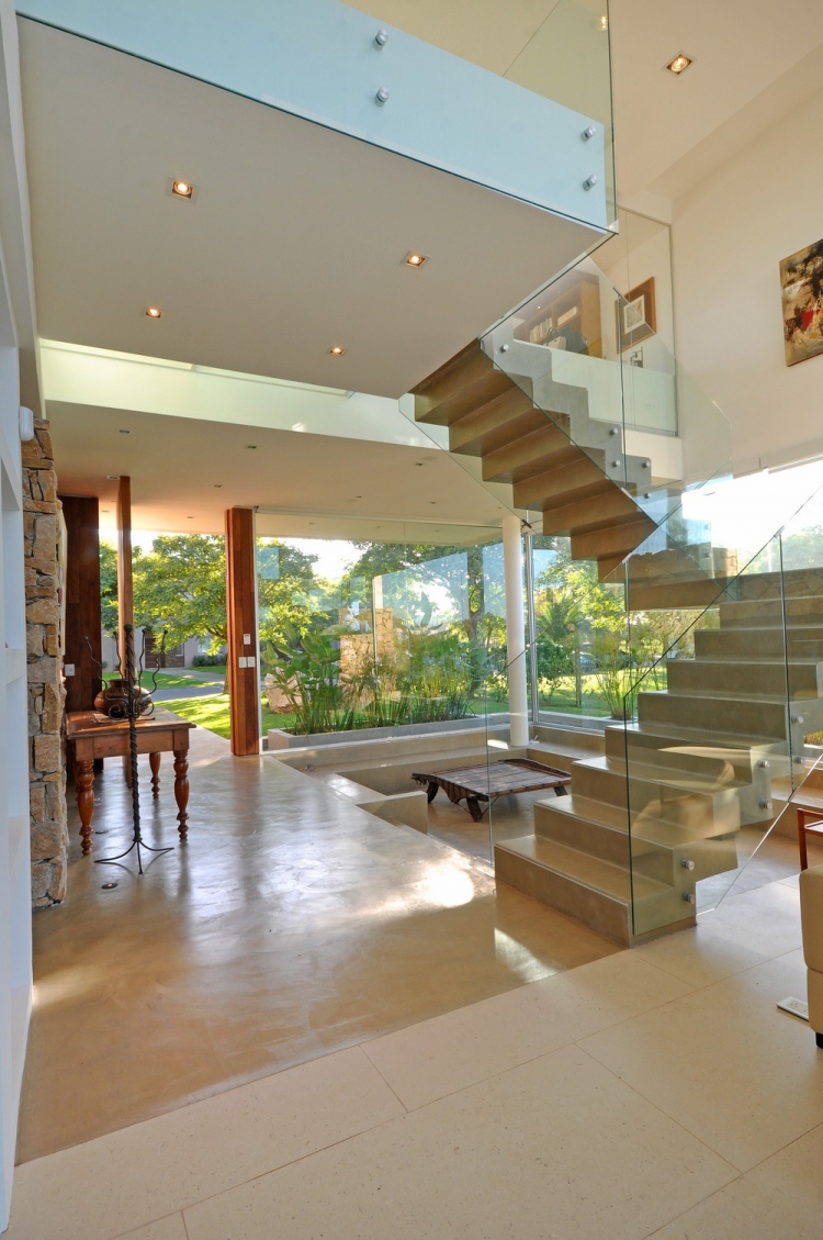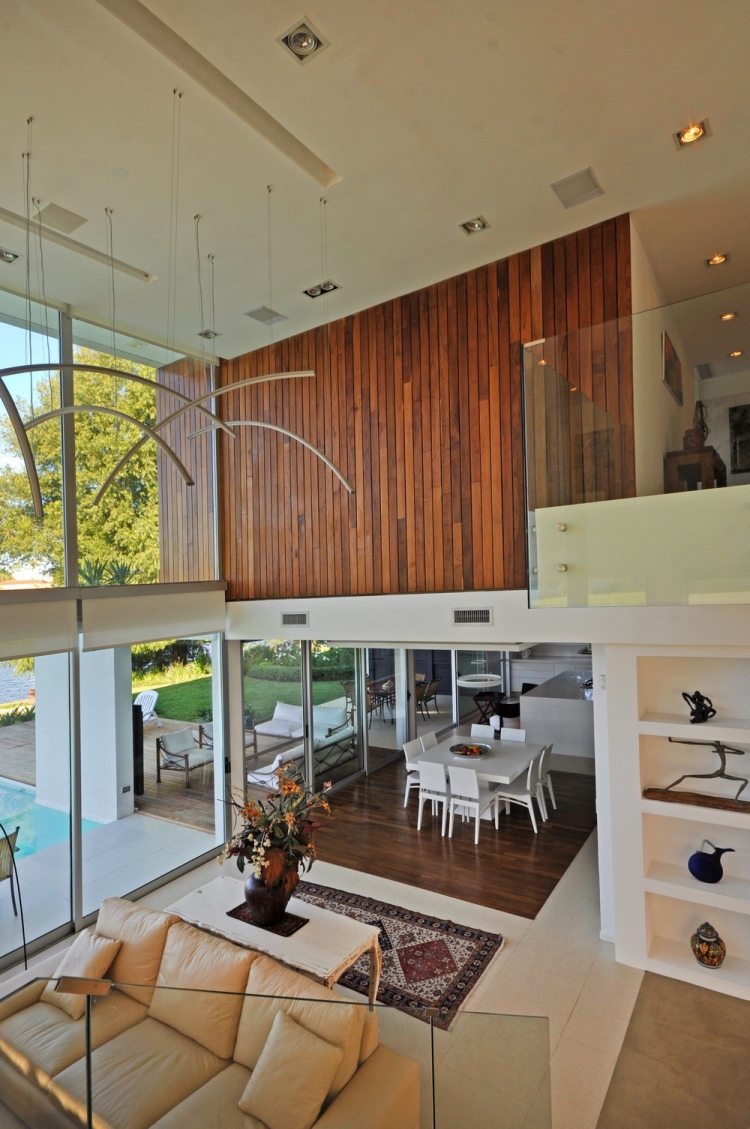 Дом состоит из двух этажей. На первом уровне находятся общественные пространства и зона обслуживания. В свою очередь, верхний этаж включает в себя спальни и рабочий кабинет. Гостиная ломает логику распределения пространства путём создания двухуровневого помещения с различными функциями, развивающимися по вертикали.
