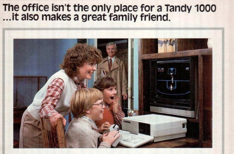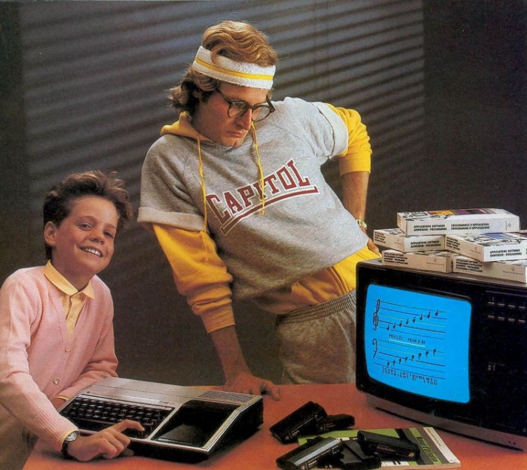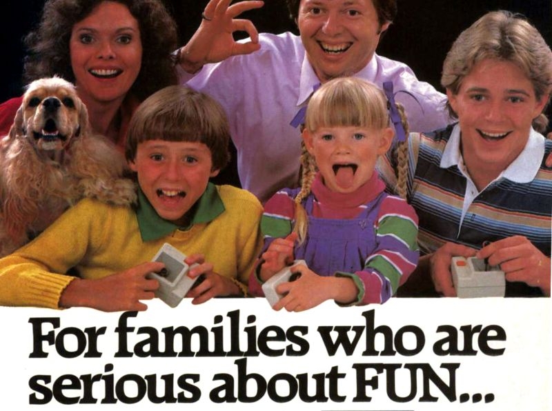 80-е года прошлого века стали прорывом в мире компьютерной техники. Электроника выбилась из цехов специализированных предприятий и вошла в жилые дома. Понятное дело, что до полноценного развлекательного формата было очень далеко, но производители в каталогах старались как можно сильнее преувеличить достоинства тогдашних персональных компьютеров и игровых консолей. Поэтому люди на фотках настолько восторжены, будто нашлось лекарство от рака или произошел долгожданный контакт с инопланетной жизнью.