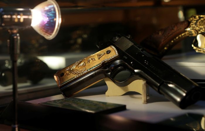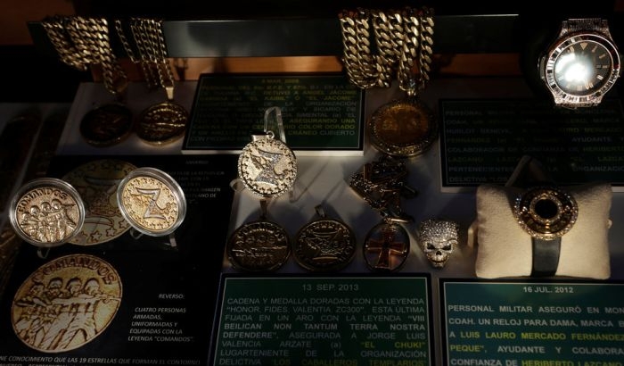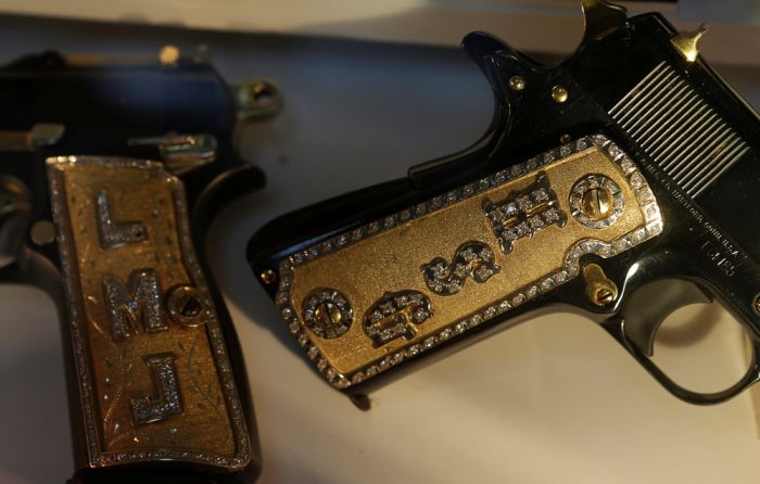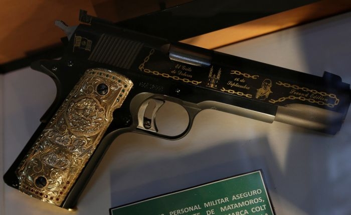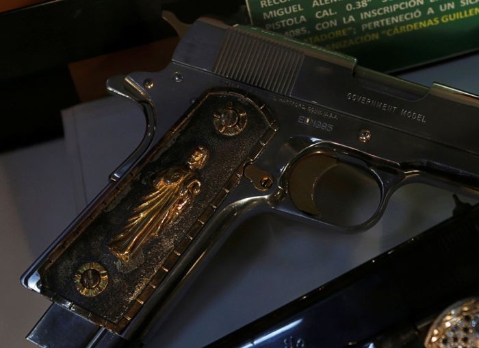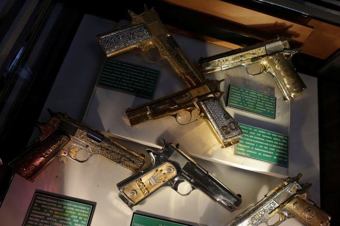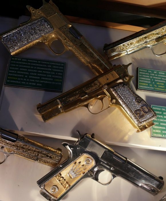 Министерство обороны Мексики в своей штаб-квартире в Мехико представило драгоценное оружие, изъятое у наркоторговцев. Вместе с пистолетами и автоматами, украшенными драгоценными камнями и металлами, были показы различные аксессуары, медали, телефоны и прочие предметы, конфискованные у преступников.