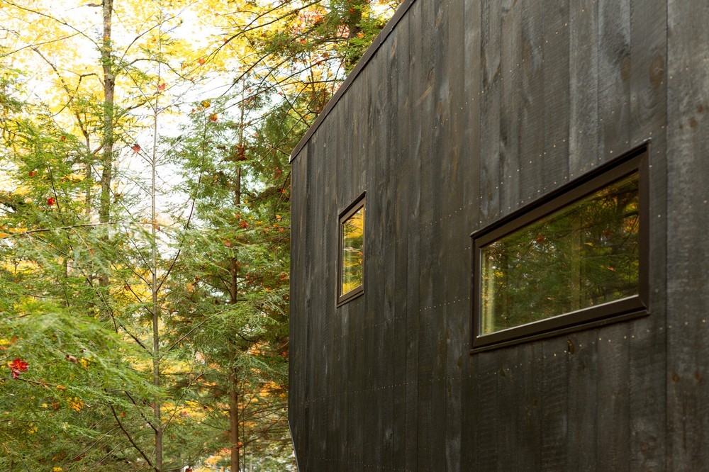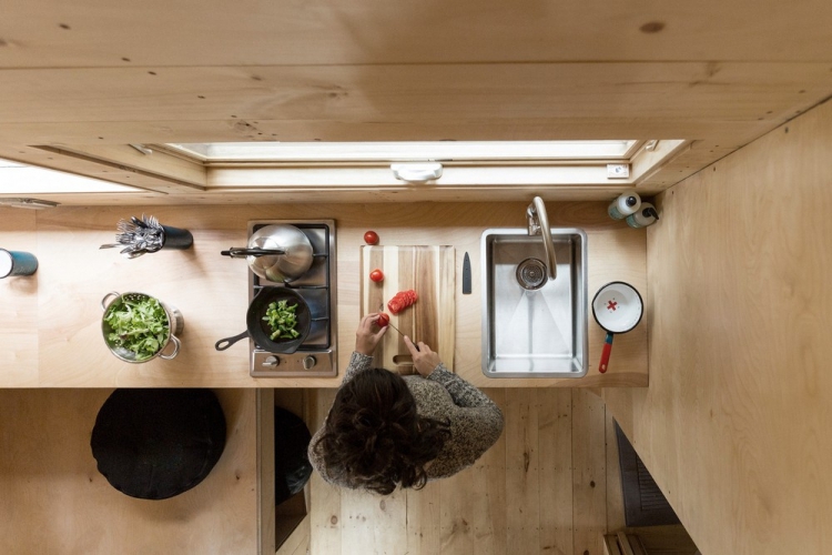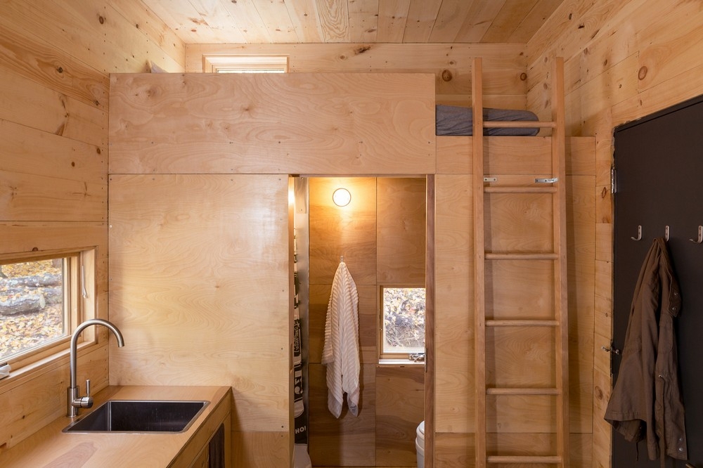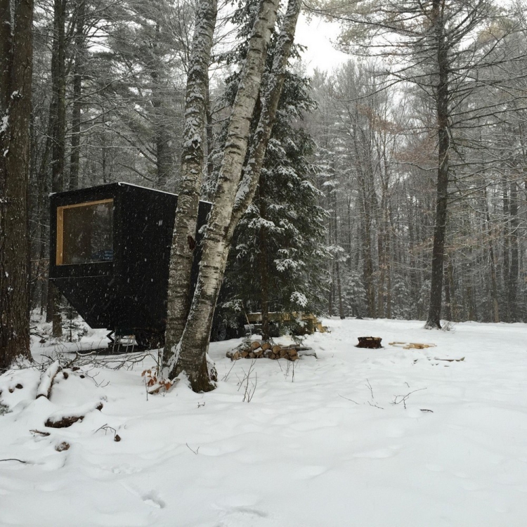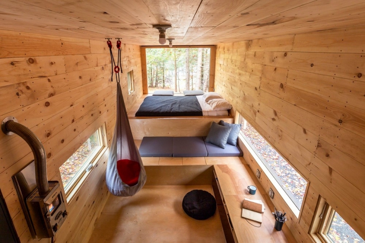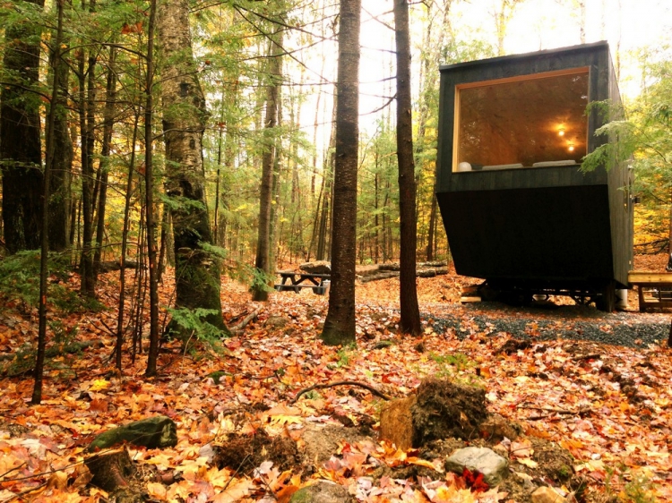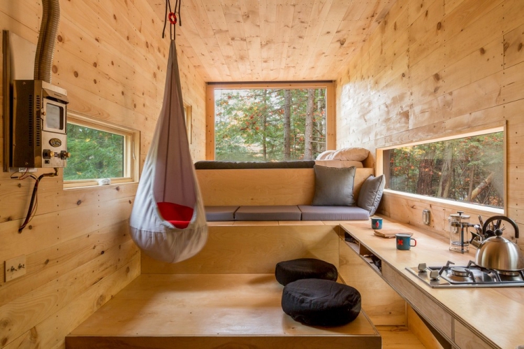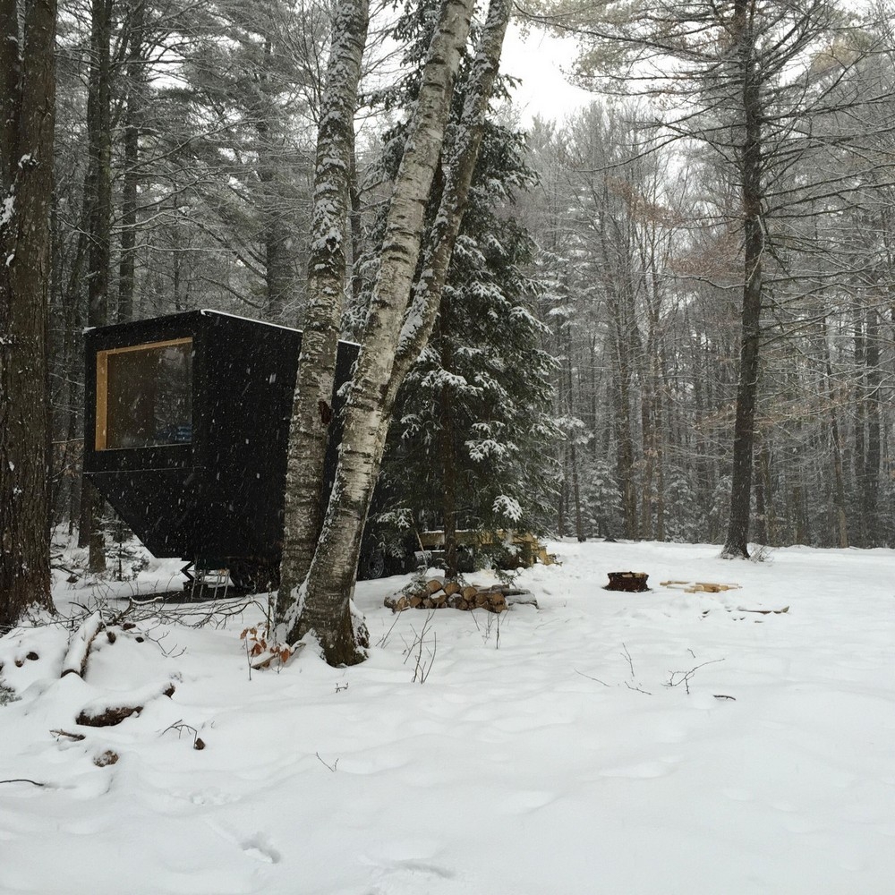 Вагончик площадью 15 квадратных метров, установленный в лесу недалеко от Бостона, США, задуман как гибкое жильё с многофункциональным внутренним пространством. Интерьер включает в себя нескольких уровней, каждый из которых наделён некоторой функциональной заданностью, но не вполне определённой, и способ их использования зависит от желания человека. Так, поверхность для сидения становится спальным местом или зоной для еды, или даже платформой, по которой ходят. Домик оснащён необходимыми для жизни сантехническими и электрическими системами, а также газовым отоплением.