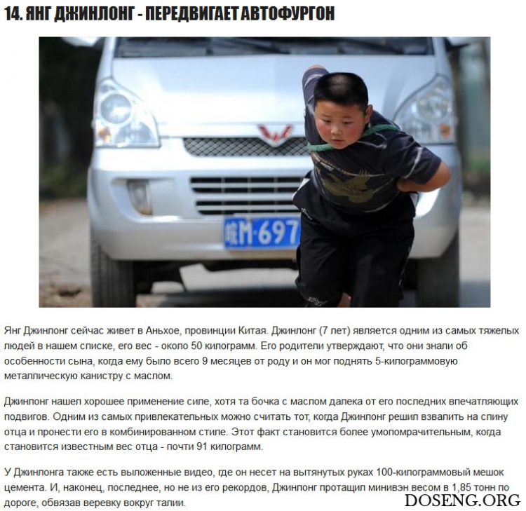 Я и не думаю хвастаться, но иногда могу донести все покупки из машины за один раз. Конечно, это не делает меня силачом мирового класса, однако порой это довольно впечатляюще (в меньшей степени, если я купил всего лишь одну вещь). Но 15 детей, о которых мы поговорим ниже, точно поразят вас своей силой. Мы нашли обладателей мирового рекорда во всех категориях, и если вы думаете, что список включает только мальчиков, вы глубоко ошибаетесь, ведь и некоторые девочки получили звание силачек.