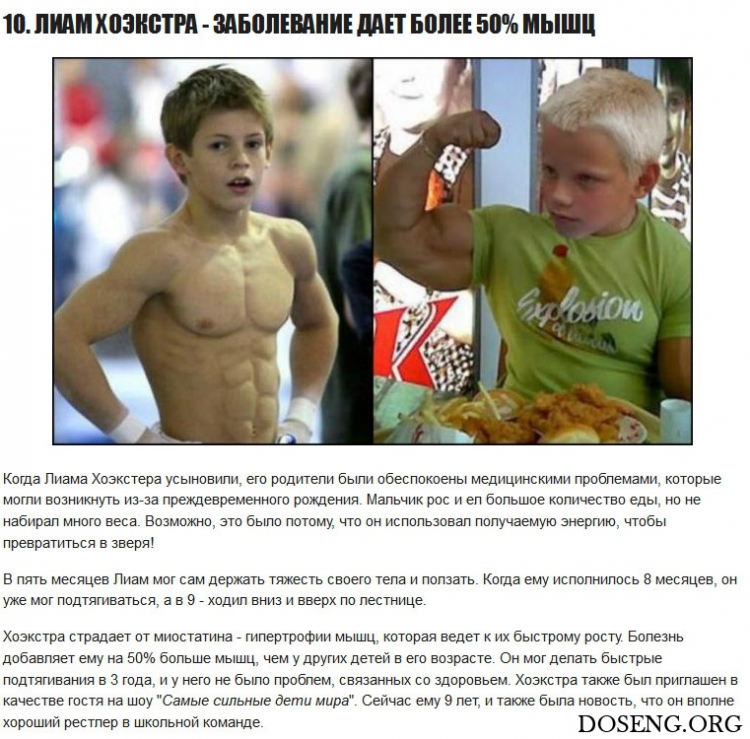 Большинство этих детей начали тренироваться, как только научились ходить. Одной девочке отец одел на руки утяжелители, чтобы она могла качать свои мышцы, будучи еще в детской кроватке! Также в нашем листе есть ребенок, который страдает от заболевания, способствующего невероятно быстрому росту его мышц. Мне это представляется настоящей суперспособностью!