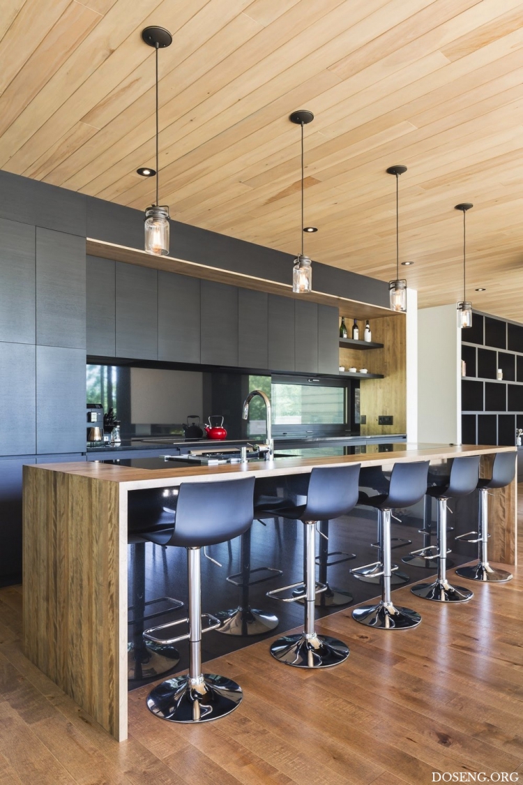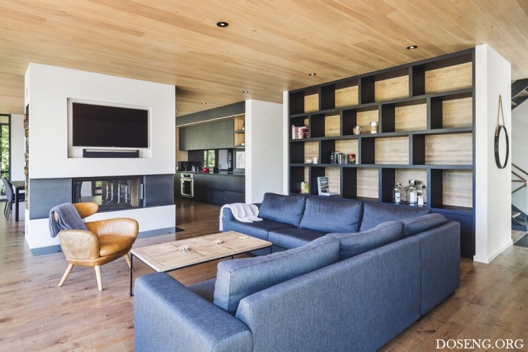 На уровне первого этажа спроектирована большая общественная зона с панорамными окнами, открывающими вид на озеро. Залитый естественным светом первый этаж заканчивается верандой. Кухня со встроенной мебелью из выкрашенного в чёрный цвет ясеня, контрастирующей с белизной стен, нарушает монохромность пространства. Двухсторонний камин, расположенный в центре гостиной, подчёркивает тёплую атмосферу уюта. Полы из натурального дерева, переходящие в террасы, создают тонкую бесшовную связь интерьера с внешним пространством. Этот главный объём, облицованный кедром, образует сердце дома, собирая вместе всё семейство. Он также является транзитной зоной между нижним этажом, отведённым для детей и обладающим более активным характером, и спокойным пространством верхнего этажа, где расположена спальня родителей.