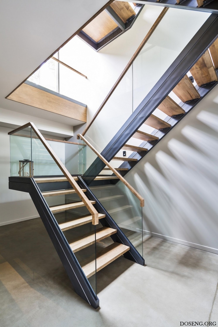 Интригующая благодаря своим сплошным массам, резиденция Estrade разворачивается перед глазами зрителя постепенно, показываясь объём за объёмом. Лёгкая воздушная лестница со стеклянными ограждениями вместо перил приветствует посетителя на входе. Выстроенная точно в линию большим вертикальным окном, она соединяет все этажи дома своими асимметричными пролётами. Минимализм и внимание к деталям привносят в пространство ощущение чистоты и комфорта, сразу задавая тон всему проекту.