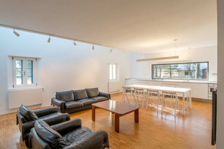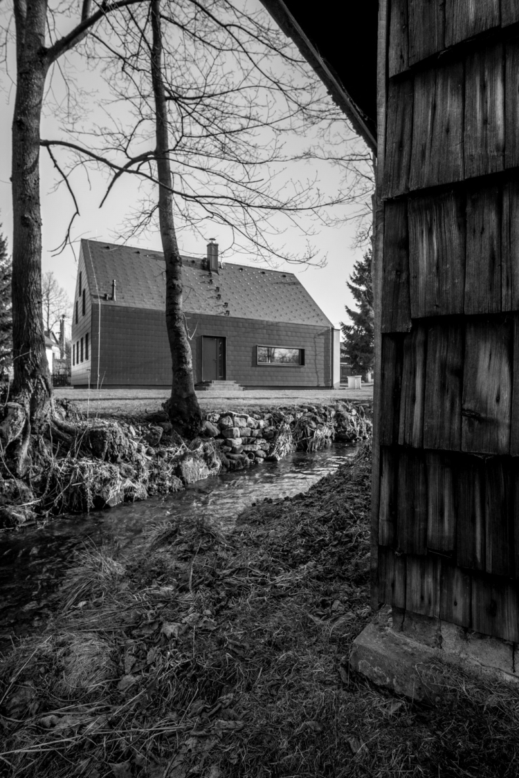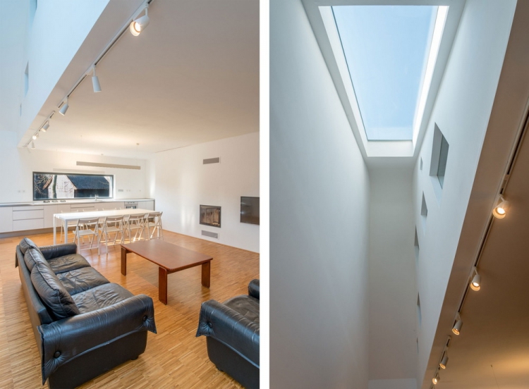 Две белых стены были сохранены как воспоминание о первоначальном здании сельского коттеджа, за ними новая масса дома, которая отличается от старого объемом, формой и цветом. Такой подход позволил чутко объединить исторический комплекс окружающих зданий с современной минималистской концепцией архитектуры. Во внутреннем пространстве также заметно разделение старого и нового. Общее пространство подчеркивается возвышением до фермы, где через большой люк на крыше получает максимум южного солнца. Окно в кухне является основным визуальным контактом с садом. На первом этаже есть гостиная, главная спальня, ванная комната, техническая комната и лестница на чердак, где есть две комнаты с окнами на фасаде и просвет над общей зоной.