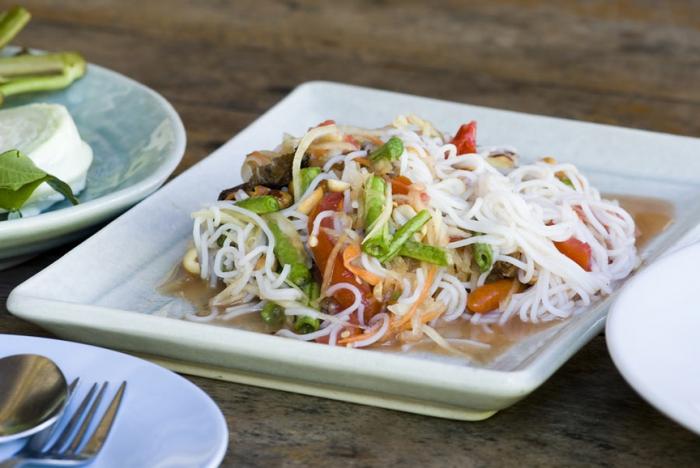 Многие знают, что самая лакомая еда в Таиланде продается на улицах — в кафешках для здешних, какие располагаются напрямик под разинутым небом. Но вдалеке не всех туристов прельщает антураж таковских заведений в облике пластиковых стульев, жар раскаленных печей и потока несущихся машин и мопедов в чете метров от столиков с едой. Ресторан Baan Somtum придумал выход: соединил комплект уличных блюд(торовато сдобренных лаймом, чесноком, чили, лимонной муравой и мятой)с цивилизованным способом их поглощения — в уютном, кондиционированном зале с покойными стульями и век готовым опамятоваться на поддержка шеф?поваром.