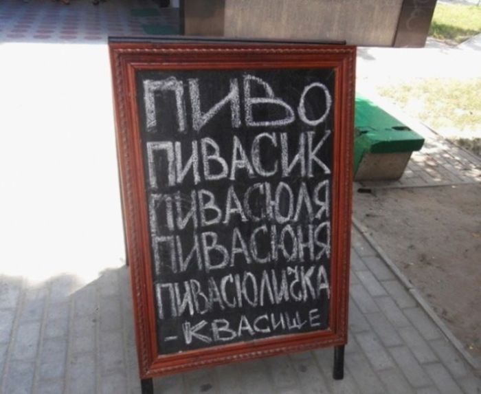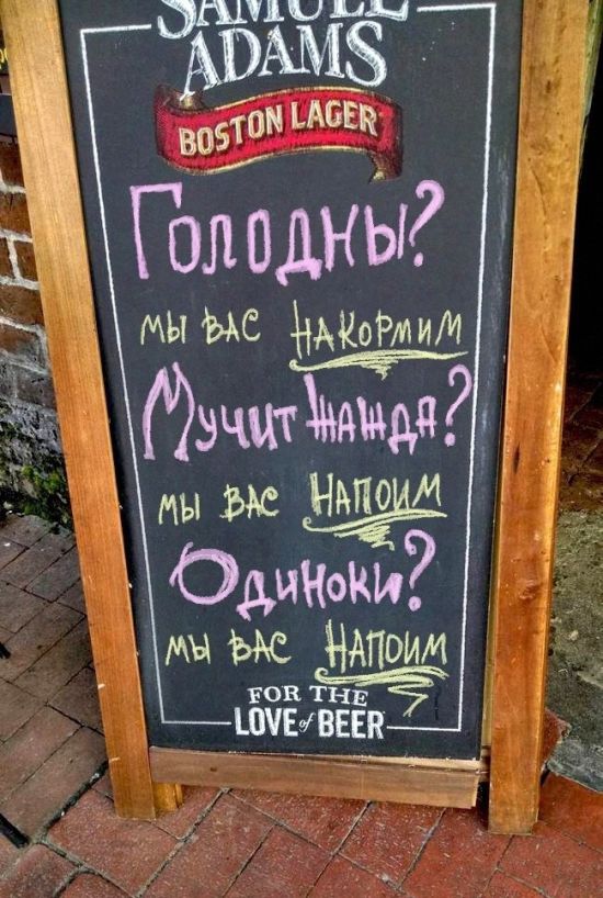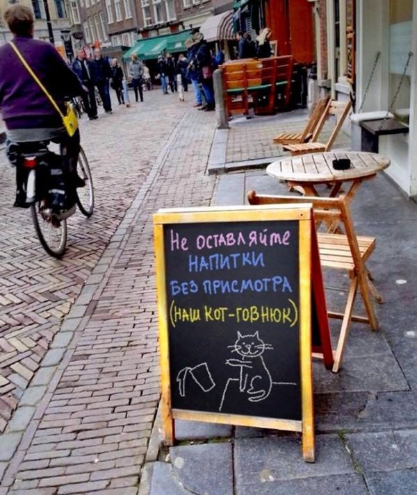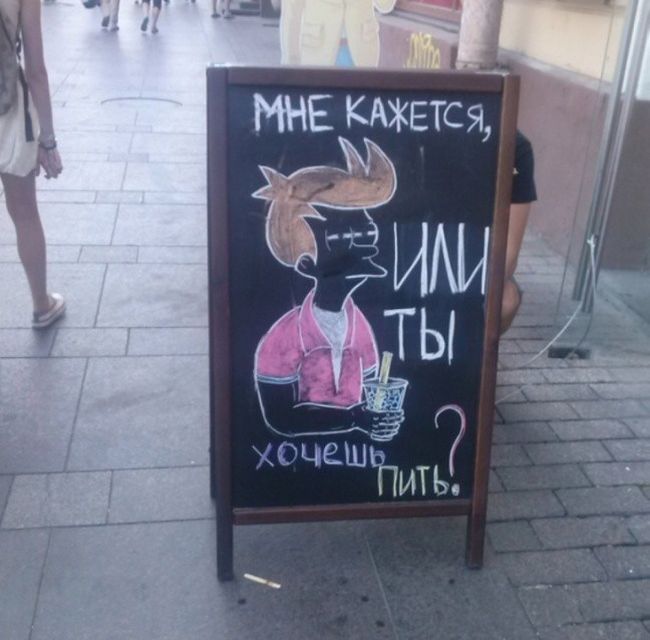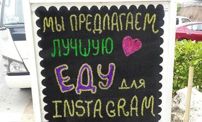 Самописными объявлениями на досках будто внутри, настолько и извне заведений коллективного питания никого не удивишь. Но у владетелей этих кафе всё же вышло привлечь наше внимание, уж больно креативными и оригинальными очутились надписи. Вашему вниманию эти самые созданья «доскоукрашательного» искусства, призванные привлечь будто можно вяще потенциальных клиентов.