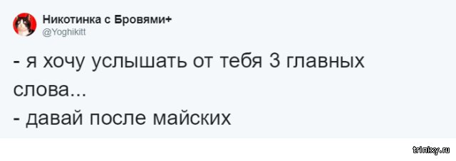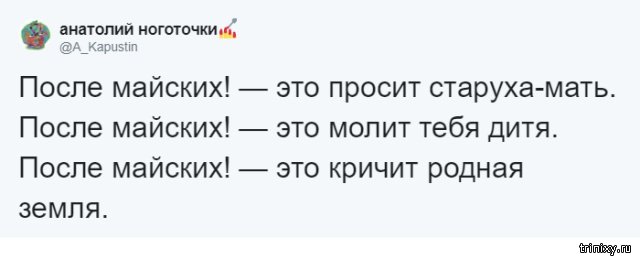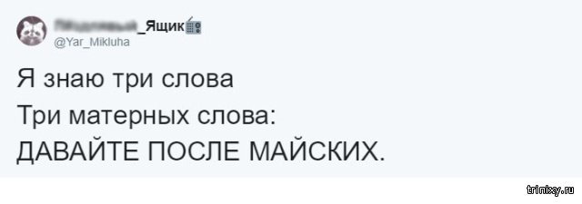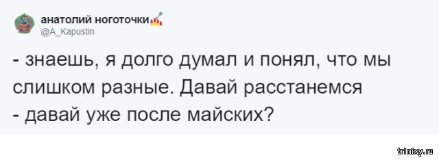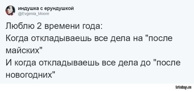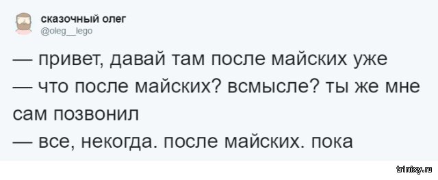 Многие из нас пробуют придумать какую-то отговорку, дабы не ладить те или другие девала напрямик сейчас. Но ныне настал тот самый момент, когда можно передвинуть любое девало итого одной фразой: "Давай после майских", какая даже стала взаправдашним мемом в Twitter. Эту фразу и взаправду можно использовать в любой ситуации.