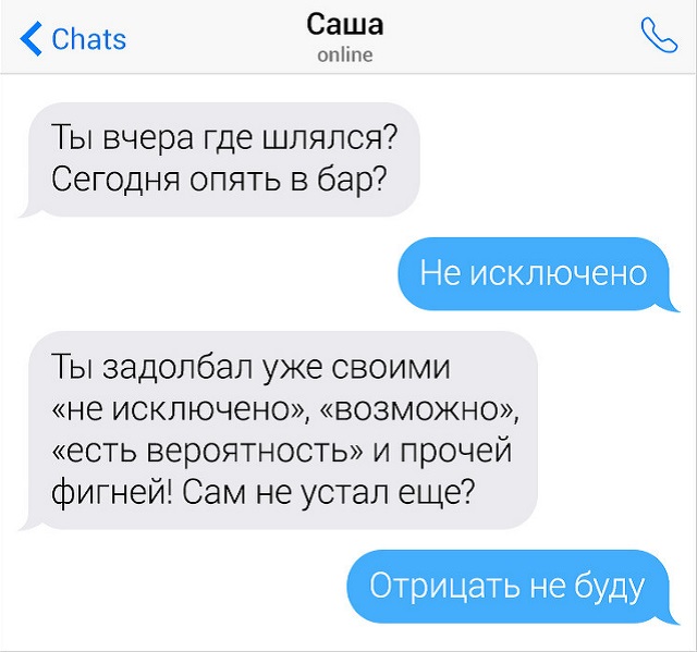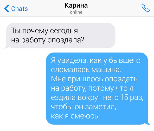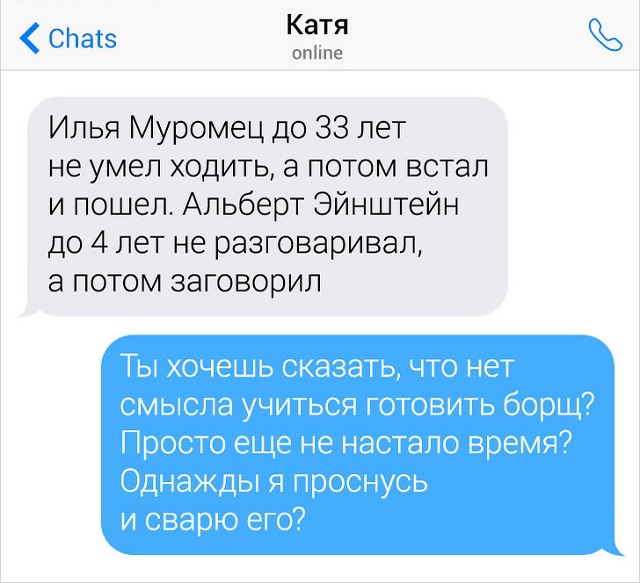 Иногда в жизни может случиться таковая ситуация, когда чаша терпения переполняется и вырвавшийся мощный поток эмоций уже не застопорить. Самое основное в этот момент не влететь под горячую десницу или под "неласковое" слово. Но необязательно быть буддистом и медитировать в пещере, дабы совладать с вырастающими негативными ощущениями. Сарказм - самый безыскусный и эффективный способ в данной ситуации. Это недурно продемонстрировано в переписках героев этого поста.