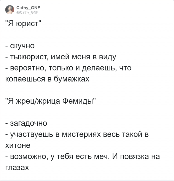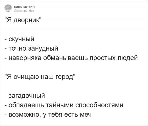 Где, будто не в Твиттере собираются дилетанты подурачится и фантазировать. На этот один пользователи постановили обделать и флешмоб и показать невеселые специальности с необычной сторонки. И невредно, дабы вышло загадочно. Организатором выступил редактор-корректор Дэвид Ист. В описании своей работы он наметил себя будто человека, какой выправляет чужие оплошки - и, вероятно, у него даже жрать меч!Пользователи бойко подхватили эту схему. Давайте посмотрим, что у них вышло.