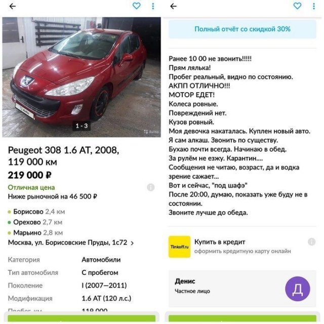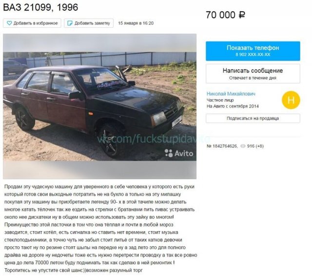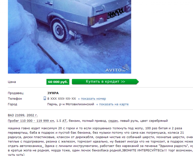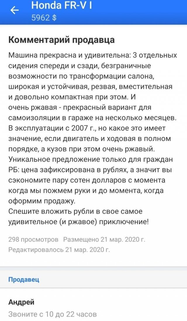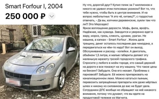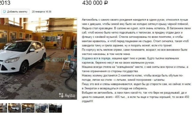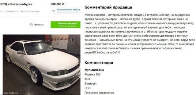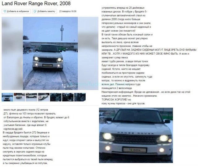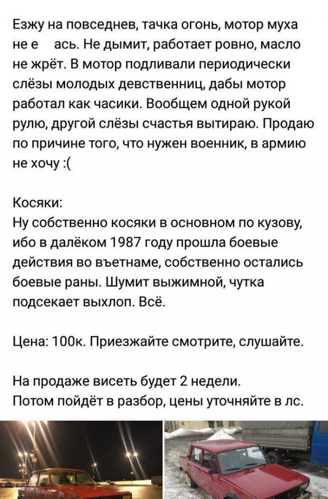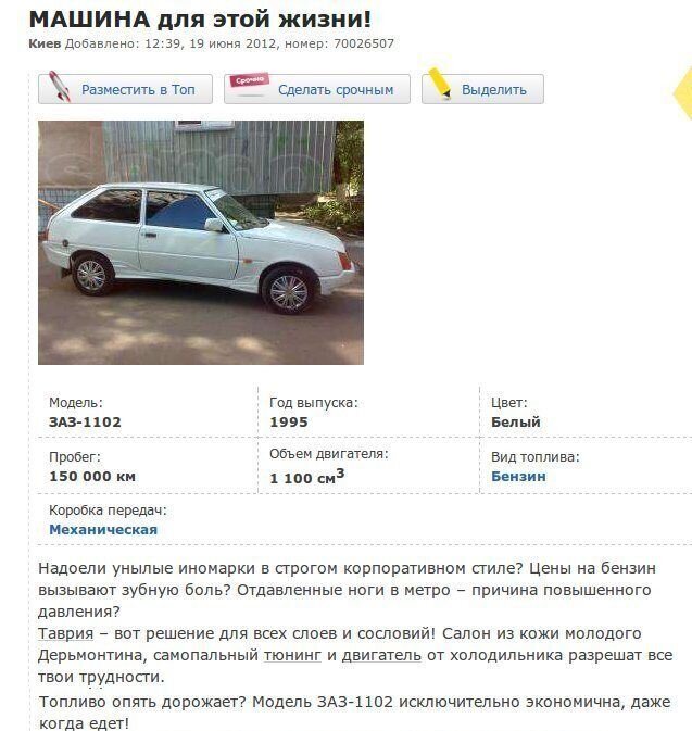 В Интернете жрать бездна сайтов, назначенных для торговли автомобилей. Однако конкуренция заставляет продавцов как-то выделять свои объявления, ладя их более занимательными и необычными. А авторы этих объявлений даже капельку переусердствовали, экспонируя на торговлю свои машины. Однако вышло будет забавно.