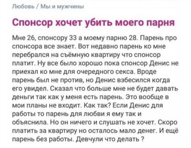 Пожалуй, никого в наши дни не удивить барышнями, какие не алкают ничего ладить, однако желают получать все дарма. Они разыскивают спонсоров, даже не норовя научиться чему-нибудь самостоятельно. Правильно это или дудки - решать не мне. Однако временами они переходят все меры, без зазрения совести выкладывая подобные посты в социальные сети.