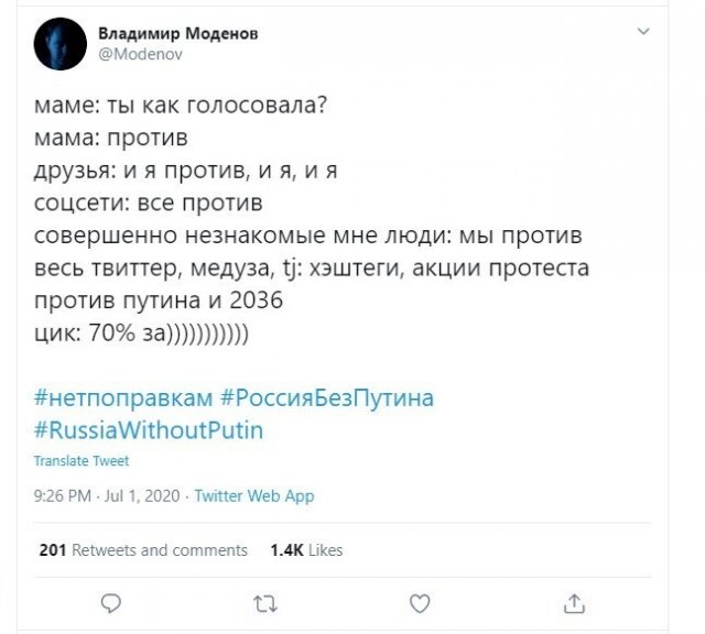 В России стали знамениты итоги по голосованию к поправкам в Конституцию. Правда, не все пользователи остались ими довольны - вот будто реагируют на новости в Сети.