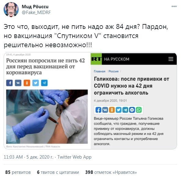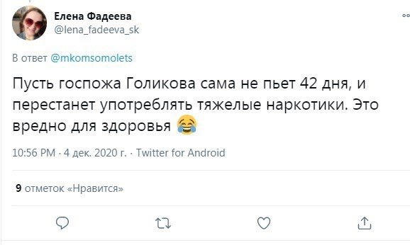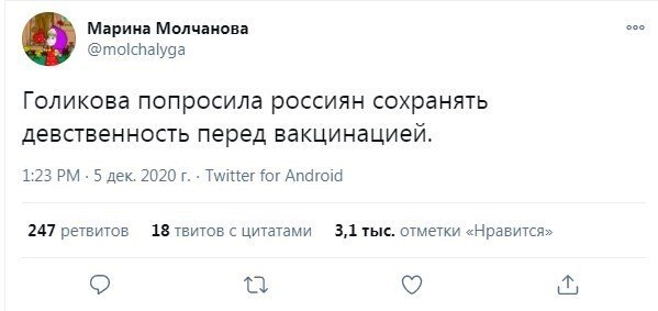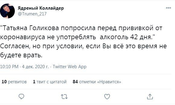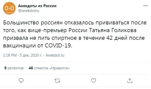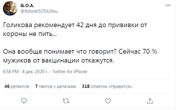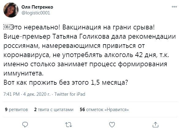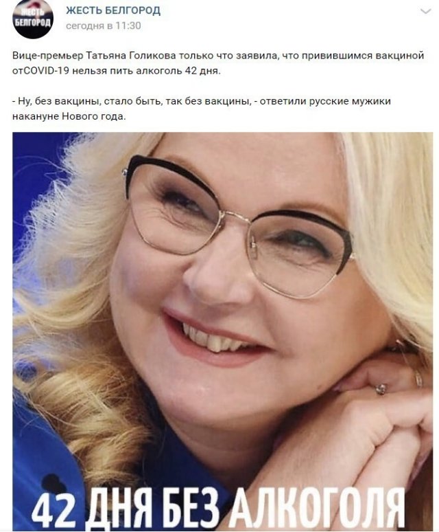 Вице-премьер Татьяна Голикова выступила недавно с заявлением о том, что не рекомендуется использовать алкоголь в стадия вакцинации. Рекомендуемый срок воздержания - 42 дня. А спереди ведь новогодние праздники, оттого пользователи социальных сетей по-своему отреагировали на слова чиновницы.