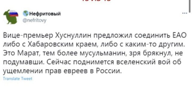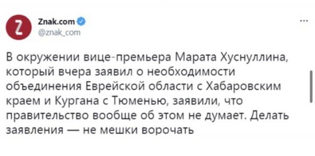 Вице-премьер пожаловался на то, что в нашей стороне излишне бессчетно регионов. И пользователи Сети не могли миновать мимо этих фраз. «Я почитаю, что нам 85 регионов не надобно. Это первое, с чего надобно взяться, — заявил Хуснуллин на круглом столе. — Вот я Еврейским автономным округом, зоной, округом не алкаю заниматься. Не алкаю с точки зрения трудозатрат. Его надобно соединить либо с Хабаровским концом, либо будто, и нехай губернатор им занимается. Или Курган. Ну зачем курганцы должны жительствовать аховее тюменцев?У одних жрать нефтяные доходы, у иных дудки. У нас что это — обитатели иной стороны?»