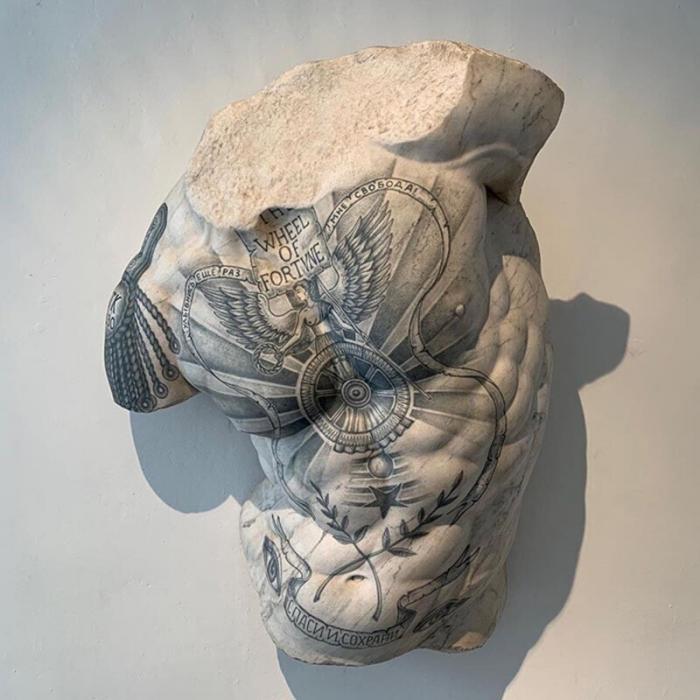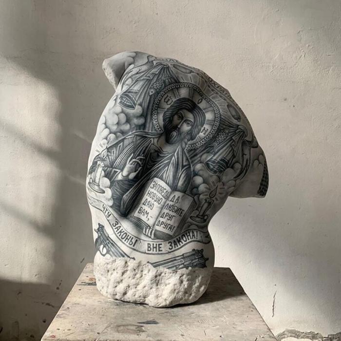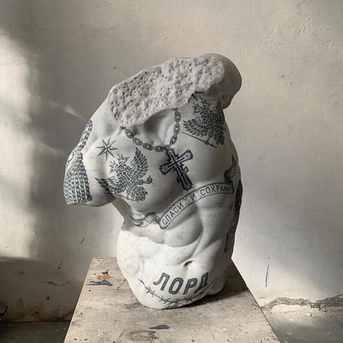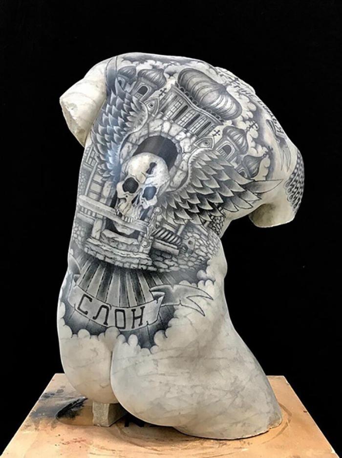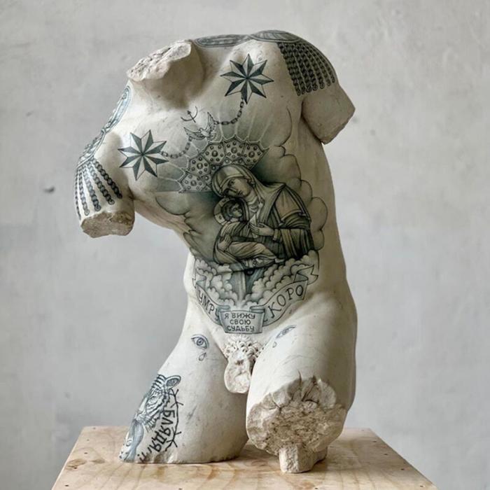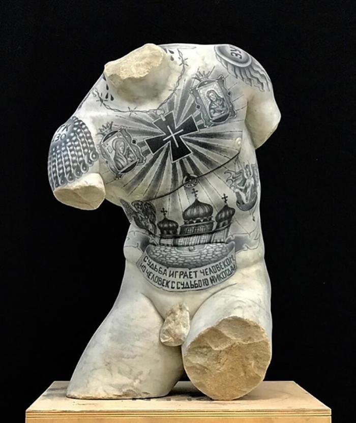 Итальянский художник и ваятель Фабио Виале(Fabio Viale)постановил свести два невообразимых облика искусства — скульптуру и татуировку. В настоящем посте вы найдете татуировками в восточном манере и тюремные наколки, навитые артистом на поверхность скульптур.