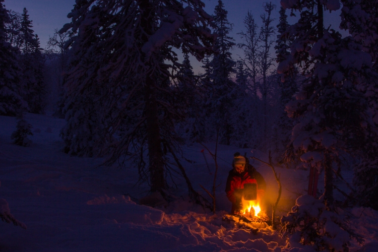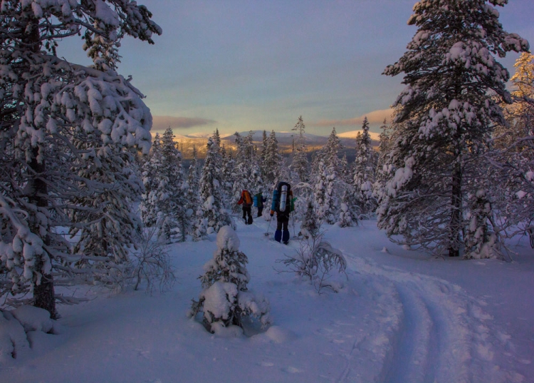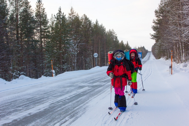 Мы высадились с поезда Москва - Мурманск в Кандалакше рано утром, затем, подождав автобуса до д. Лувеньга и проехав буквально минут 15, вышли на маршрут. Звучит достаточно бодро. На самом деле когда мы одели лыжи и ждали пока Вовка разберется с креплениями, казалось, что автобус привез нас в самый настоящий ад. Только в аду должно было быть жарко и светло (ну мне так кажется), а в том самом месте на шоссе была кромешная темнота и жуткий холод. Мы наматывали круги вокруг собирающихся, чтобы хоть чуть согреться. Но ноги и руки отказали в чувствительности, и мы начали с ними дружить уже в только конце похода.