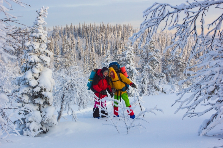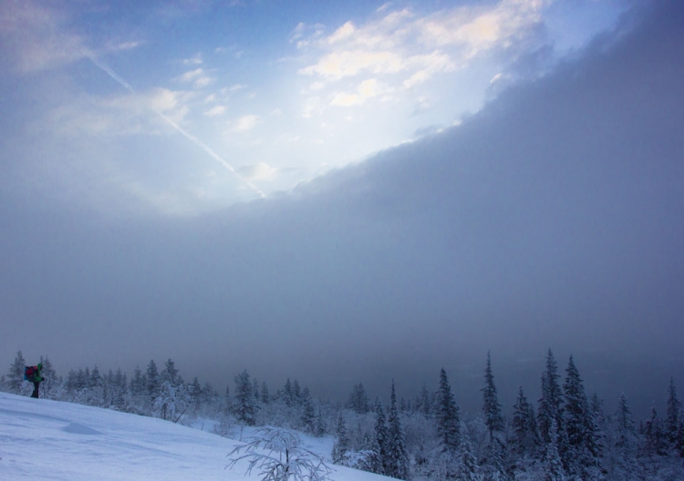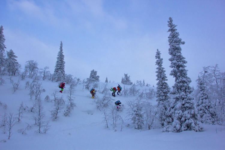 Через пару часов подул сильный ветер. Казалось в лицо впиваются осколки мантии Снежной королевы. Тут у некоторых начали появляться признаки обморожения. Мы растирали белые пятна на лице и одевали маски, балаклавы - все, что могло уберечь от ветра. Пытались скрываться в лесу, но там передвигаться было сложно, и мы опять вышли на дорогу. А еще через минут пятнадцать увидели долгожданный съезд с дороги. Начался подъем. Через несколько минут тропа кончилась, и мы начали борьбу с лесным царством. Рюкзаки были тяжелые, физическая форма после новогодних бесснежных праздников тоже оставляла желать лучшего да и недосып сказался.